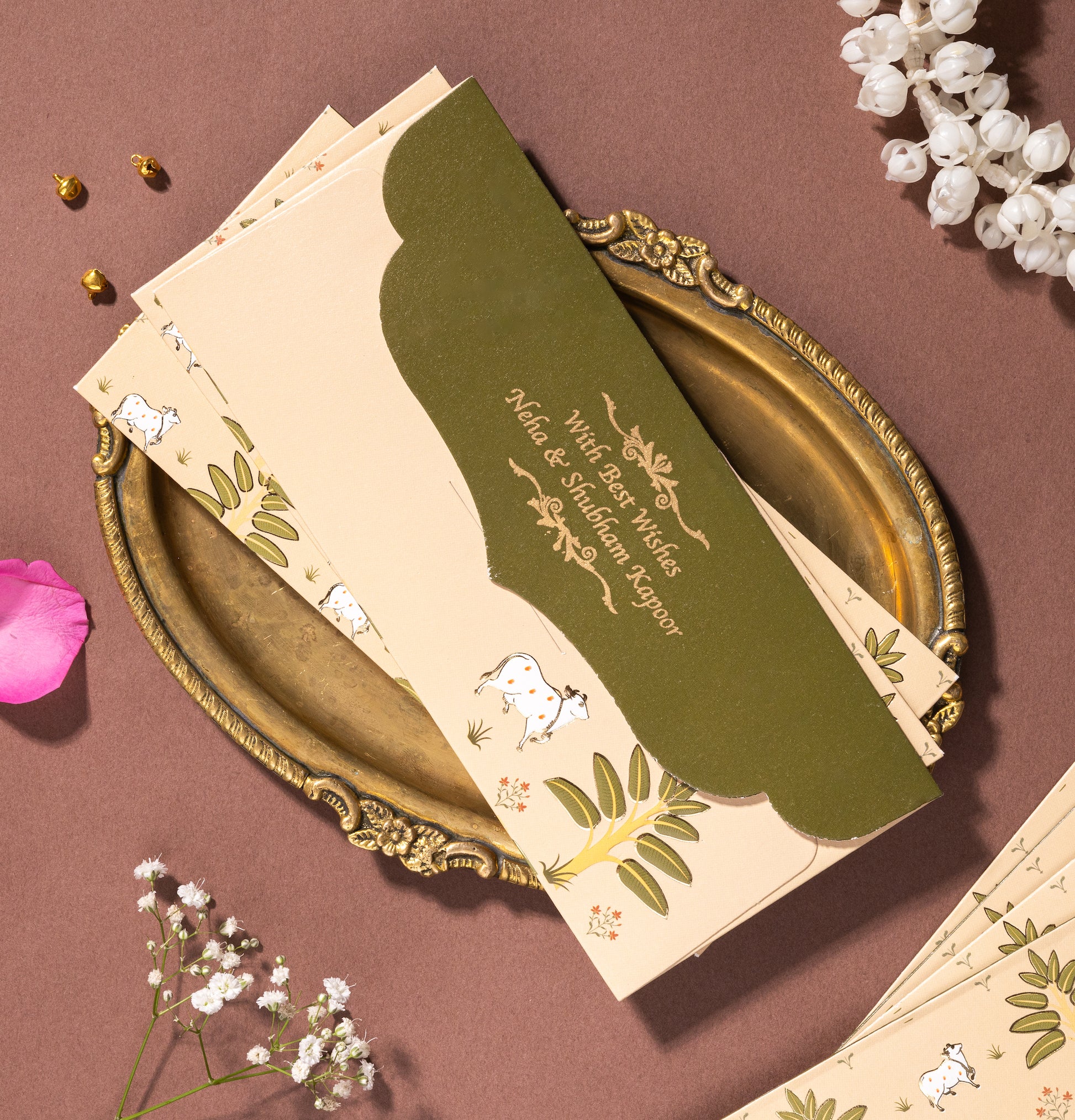 Celebrate tradition with sophistication through the Nandi design from our luxury envelope collection. Featuring the sacred Nandi god , each envelope is digitally printed with gold foiling, subtle embossing, and finished with a matt varnish for a refined look and feel.